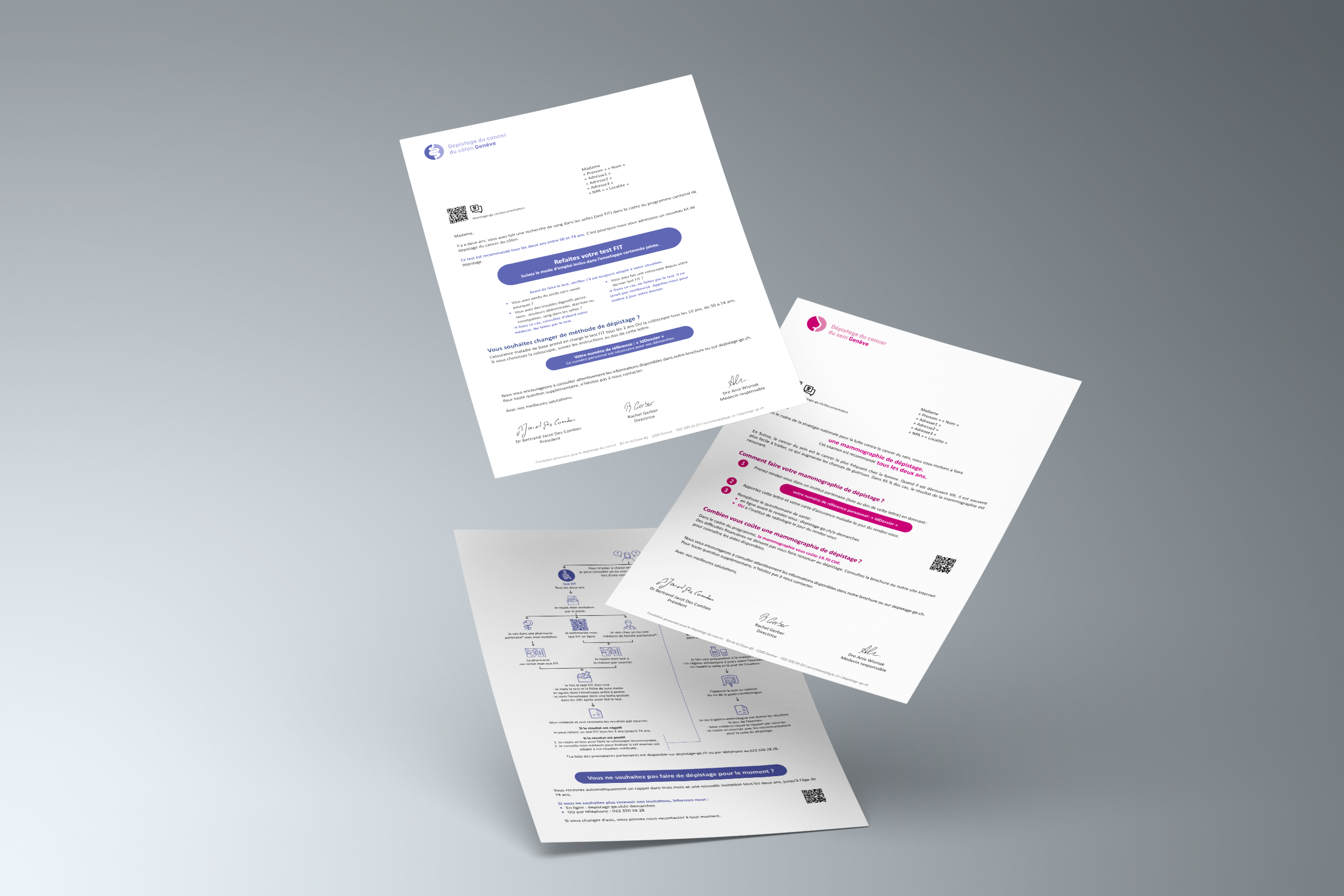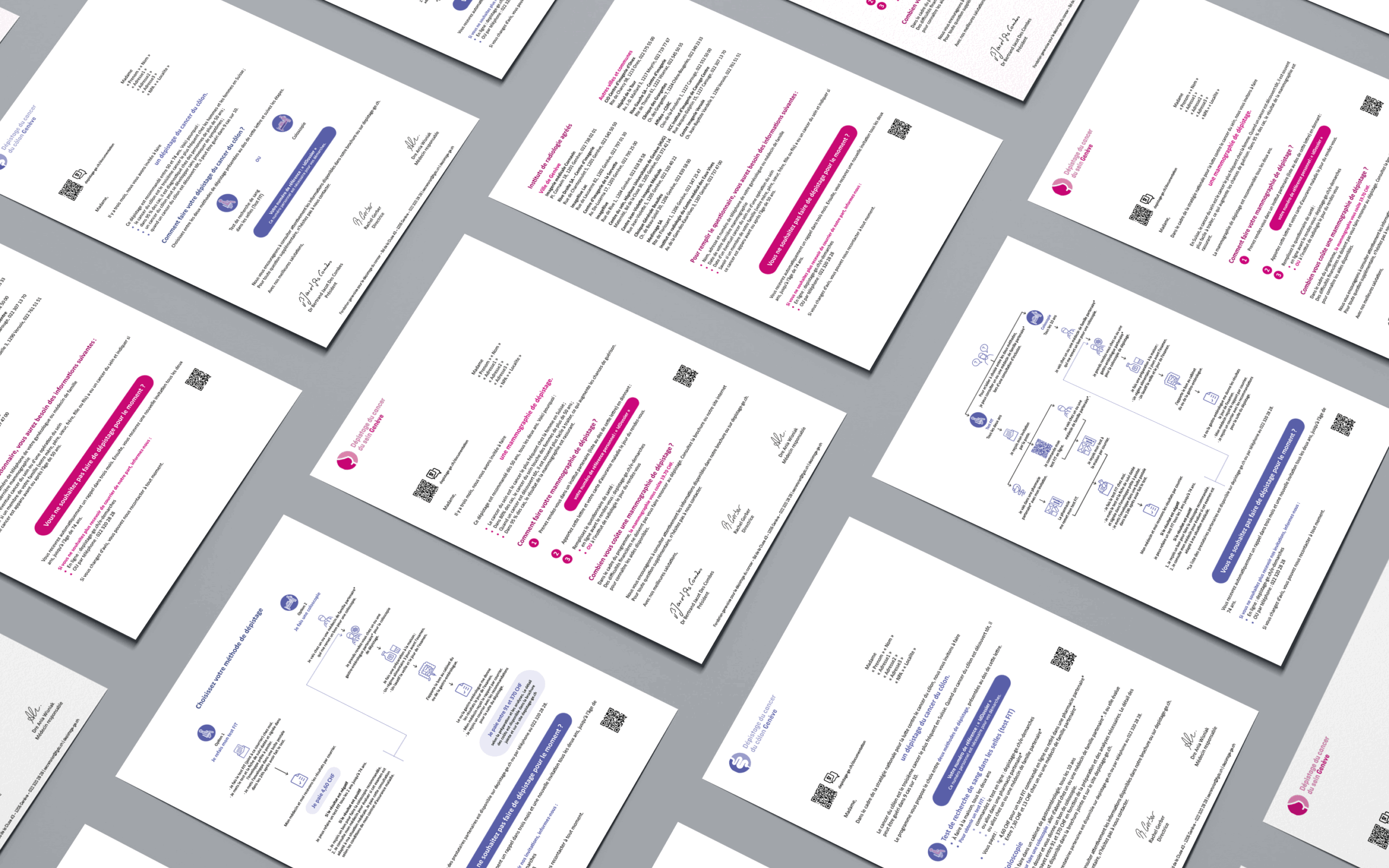 Le mandat avec la Fondation genevoise pour le dépistage du cancer a couvert un large éventail de supports de communication, destinés à informer et guider les usagers dans leur parcours de dépistage.